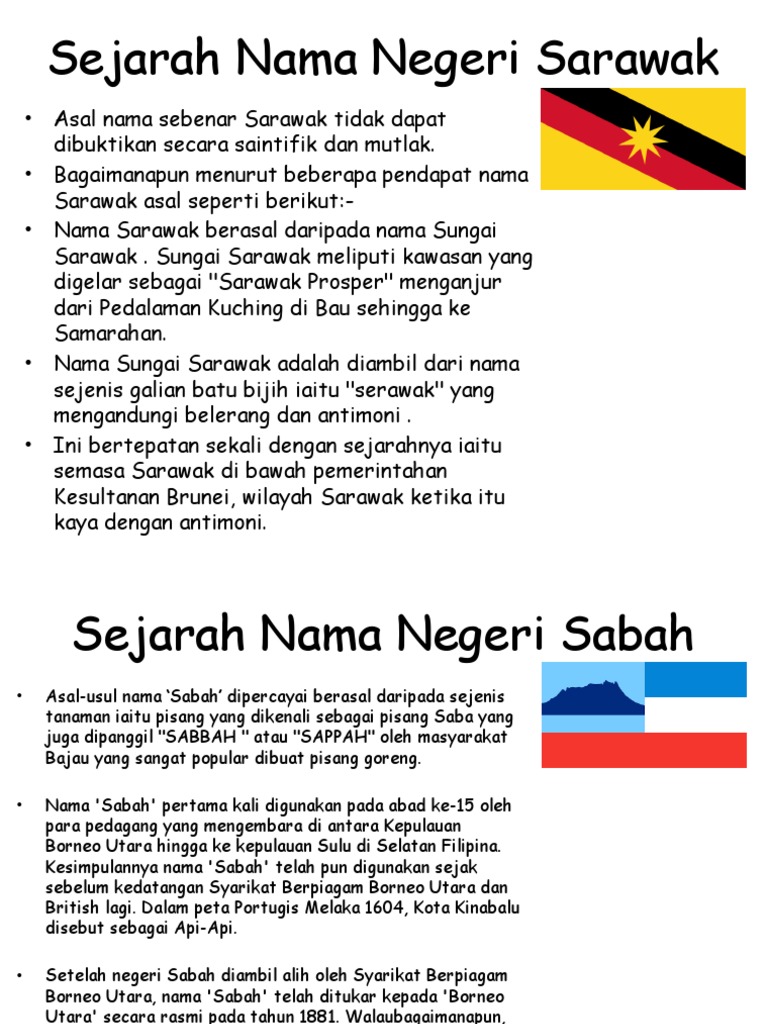 Sarawak dan sabah yang terletak di pulau borneo biasanya digolongkan bersama sebagai malaysia timur. Tahukah anda asal usul nama sebenar sarawak tidak dapat dibuktikan secara saintifik dan mutlak. Negeri sembilan kemudiannya menyerahkan klang kepada selangor, ulu pahang dan jelai kepada pahang dan segamat kepada johor. Rakyat sarawak mula mengenali kek lapis apabila warga betawi datang ke sarawak dan mengajar cara membuat kuih betawi. Ada 20 gudang lagu asal usul negeri sarawak sejarah terbaru, klik salah satu untuk download lagu mudah dan cepat.