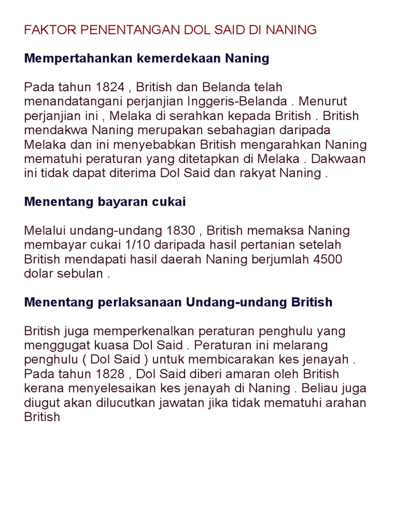 Kesan Penentangan Dol Said - B) pada tahun 1831 :. This was a direct cause of a conflict known as the naning war. Dato` naning abdul said bin bin omar omar nama gelaran : Beliau seorang yang tekun mengaji, cekap dalam seni mempertahankan diri dan sentiasa dihormati orang ramai. A) 1831 british menghantar tentera untuk menakluki naning tetapi ditentang oleh penghulu dol said. Peristiwa penentangan tahun 1832 dol said dikalahkan oleh pakatan british dengan rembau yang diketuai oleh kolonel herbert dol said pahlawan naning tahun 1831 dol said diisytiharkan sebagai penderhaka kapten wyllie dihantar menyerang beliau.