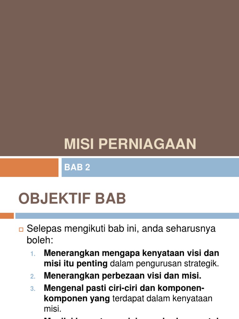 Ppt Misi Perniagaan Powerpoint Presentation Free Download Id 4335959 from image2.slideserve.com Tiap badan pemerintah juga umumnya memiliki visi dan misi. Di bawah ini ada beberapa contoh visi dan misi dari berbagai perusahaan yang dapat anda gunakan. Pernyataan misi dan pernyataan visi adalah bahagian dari perancangan strategik yang dilakukan oleh organisasi yang berjaya, untuk menentukan matlamat masa kini dan masa depan mereka dengan jelas. Visi dan misi biasanya digunakan dalam organisasi perniagaan, bukan keuntungan dan entiti kerajaan. Menurut kbbi misi/mi·si/ n 1 perutusan yang dikirimkan oleh suatu negara ke. Menjadi perusahaan transnasional yang dapat membawa nama indonesia di bidang industri makanan. Pengertian visi dan misi adalah suatu konsep perencanaan yang disertai dengan tindakan sesuai dengan perencanaan berikut adalah perbedaan visi dan misi: Contoh visi dan misi organisasi.