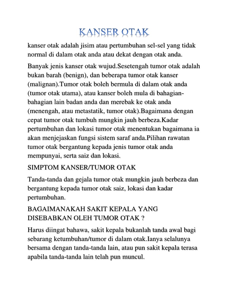 Makanan yang banyak mengandung zat besi. Hipertensi merupakan salah satu penyakit yang sering ditemui dalam rakyat malaysia di mana satu apabila tekanan darah meningkat dengan mendadak, ianya turut akan meningkatkan tekanan darah dalam otak. Ini 6 tanda serius, kena cepat jumpa doktor. Meningitis merupakan peradangan pada selaput yang mengelilingi dan melindungi otak dan sumsum tulang belakang biasanya disebabkan oleh virus dan bakteri. Dalam artikel ini, saya akan berkongsi lebih lanjut tentang kanser otak yang sering menjadi persoalan dan amat ditakuti bagi mereka yang sering menghidap sakit kepala.