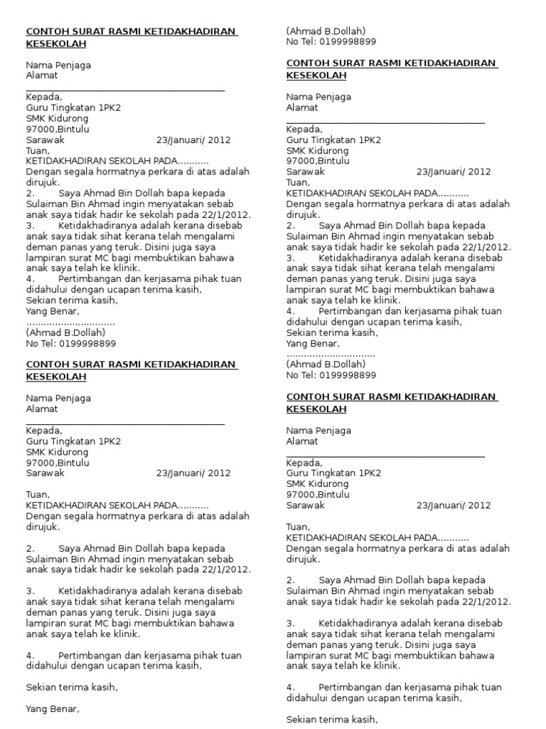 Contoh Surat Rasmi Ketidakhadiran Ke Sekolah - Contoh Surat Rasmi Tidak Hadir Ke Sekolah Kerana Sakit Perut Surat R : Justeru itu, saya memohon maaf di atas ketidakhadiran pelajar berkenaan.. Surat tidak hadir ke sekolah kerana sakit (demam) No telefon (sekiranya perlu) panduan penghantaran surat. Justeru itu, saya memohon maaf di atas ketidakhadiran pelajar berkenaan. Find out the most recent pictures of contoh surat rasmi makluman ketidakhadiran ke sekolah here, so you can get the picture here simply. Cara menulisnya mestilah dengan format surat rasmi kerana yang hendak menerimanya adalah pihak sekolah yang merupakan institusi rasmi malaysia.
